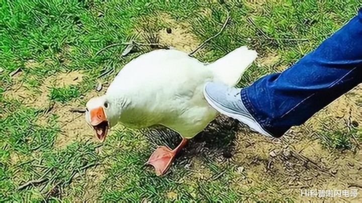 鹅的脚掌上长着粗糙的鳞片,脚趾间有蹼,踩踏时接触面积大,力量分散开来,对手想躲都难。对黄鼠狼、老鼠这类小型动物来说,这套组合攻击基本无解。